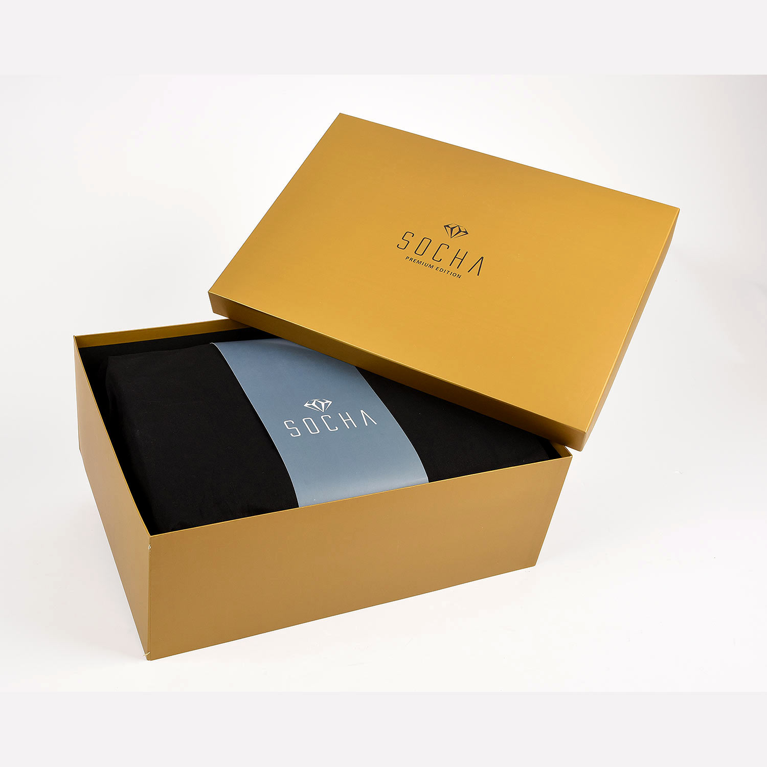 handgefertigte Deckelbox aus extra-starkem Karton. Kaschiert mit einer mattgoldenen Folie. Innenauskleidung in mattschwarz.